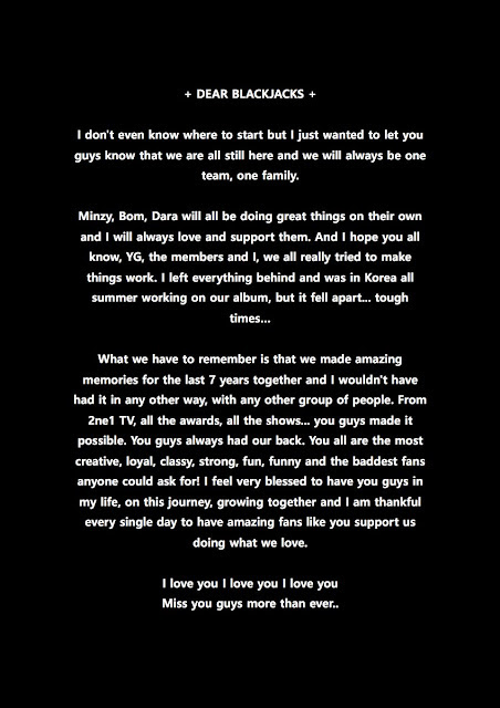 "The announcement last friday was very painful to ALL of us. But the past 7 years has been filled with good and wonderful memories I will treasure forever. We - CL, Bom, Minzy, and I - will always be 2NE1. And you will always be our loyal, supportive, and loving BLACKJACKS!!! That will never, ever change. Thank you from the bottom of my heart. - Dara of 2NE1"